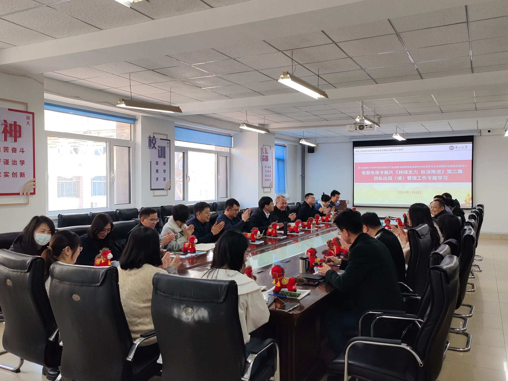 为强化教师队伍建设,筑牢校园安全屏障,学生工作处党支部于1月8日下午14:30在世纪楼302会议室召开支部党员大会,开展政治理论学习教育、保密和安全工作部署。会议由支部书记薛传佳主持,全体党员参加,普通职工和外校借调人员列席会议。