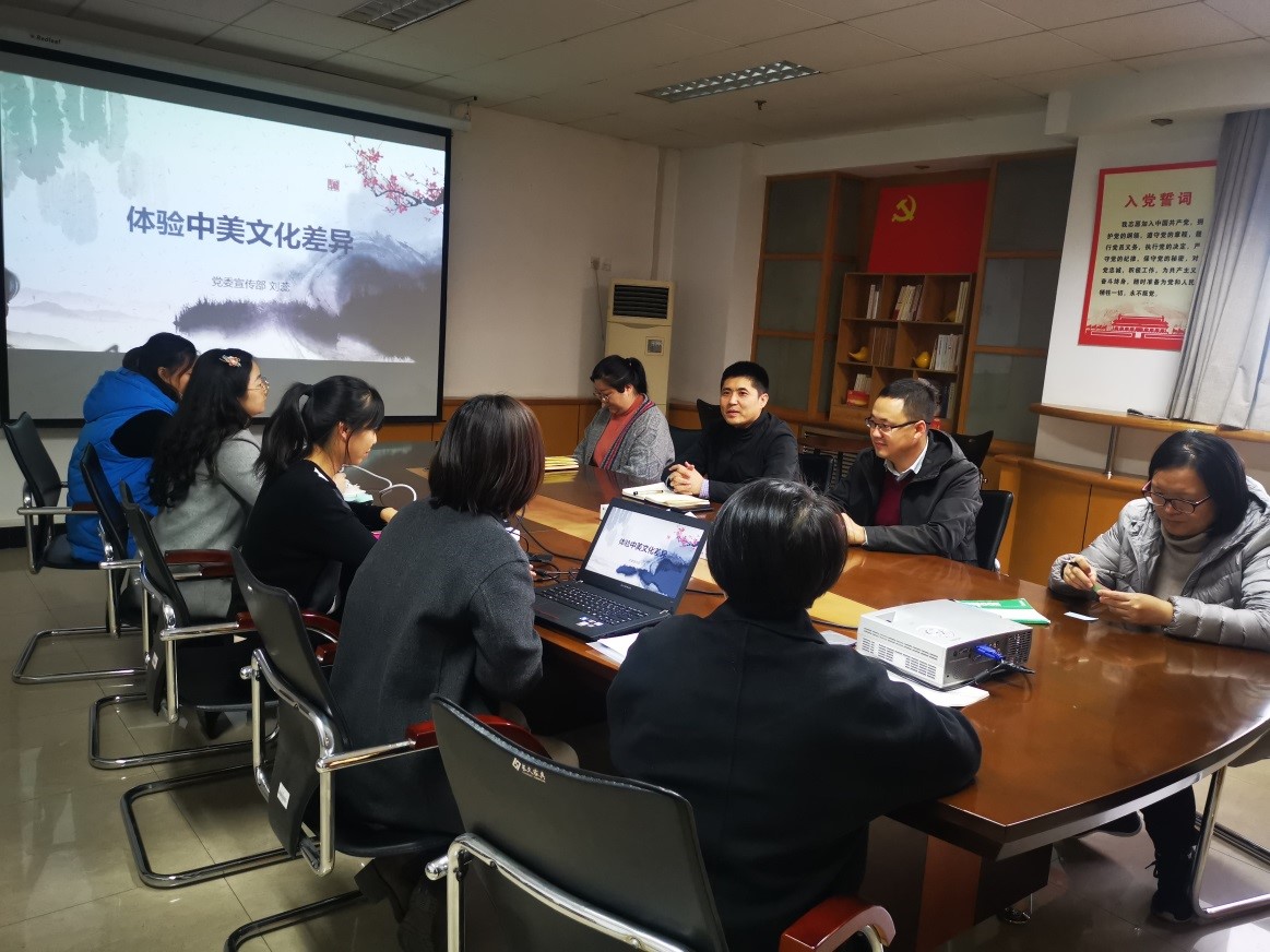 刘蕊以《体验中美文化》为题,为支部成员作了一场生动的讲座。她从中美学生和中美高校教师两个视角分别对中美学生学习情况、中美教师讲课情况等进行了比较分析,并通过小游戏使大家中美文化的差异。她还对中美在疫情防控上的区别作了阐释。